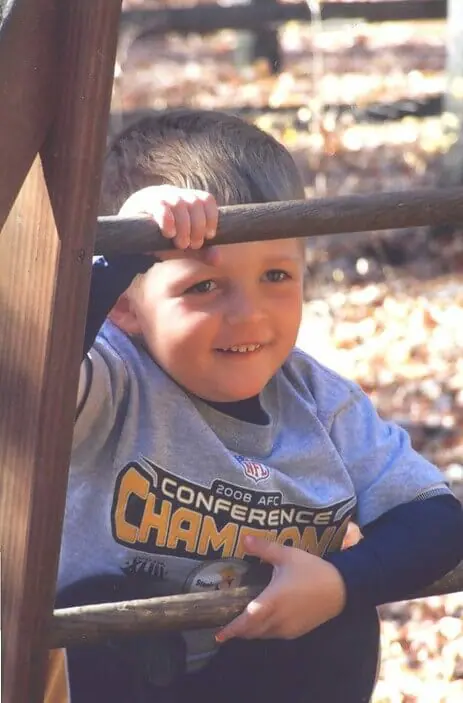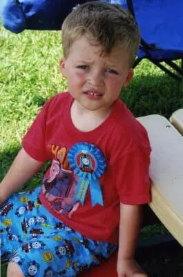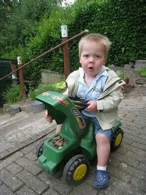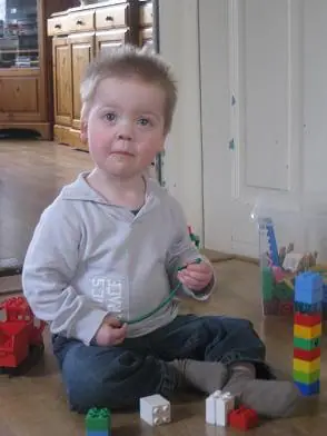それを23か月頃に歩けるようになるまで続けました。現在、彼はほぼ3歳の普通の子供になっています。胴体の回転がまだ制限されているので、振り向くのに少し時間がかかります。バランスの問題もあります。理学療法士は、彼の体のプロポーションがわずかに非典型的なため(頭が大きく、腕が短い)、よく転ぶのだと考えています。彼の腕は可動性が低いので、転んでもなかなか元に戻らず、顔から落ちてしまうことが多いのです。長距離を歩くときには特別なバギーを使います。バギーはまっすぐ座れるように作られていて、転んでも痛くないようにヘルメットをかぶっています。
