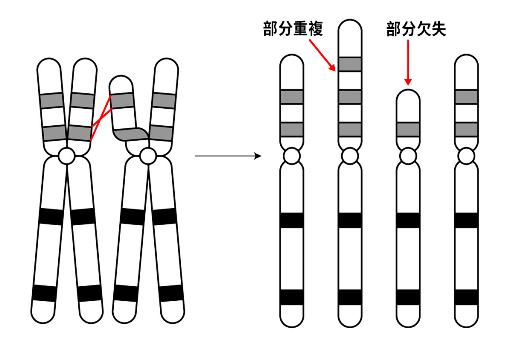 卵子と精子細胞の発生の一時点で、2本の第1染色体を含むすべての染色体が対合し、体節を交換する。 正確に対合し、交換された断片が等しくなるようにするために、各染色体は、相手の染色体上の一致した、またはほぼ一致したDNA配列を「認識」する。 しかし、染色体全体には多くのDNA配列が類似しており、誤対合が起こりうると考えられている。 その結果、不均等なスワッピングが起こり、欠失または重複が生じる。