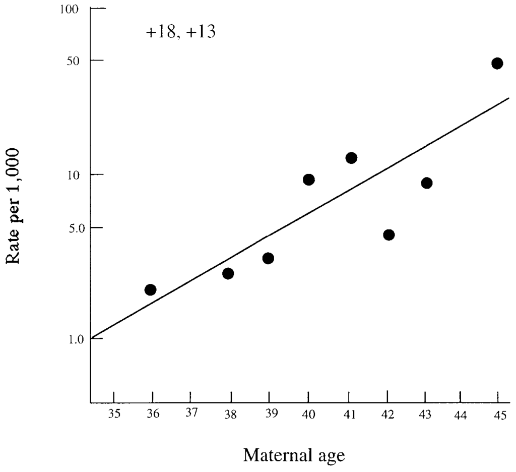 図2 致死性常染色体非整倍体 (染色体三体18和染色体三体13) 的百分比 (每1000个胎儿) (纵向) 和母亲的年龄 (横向)