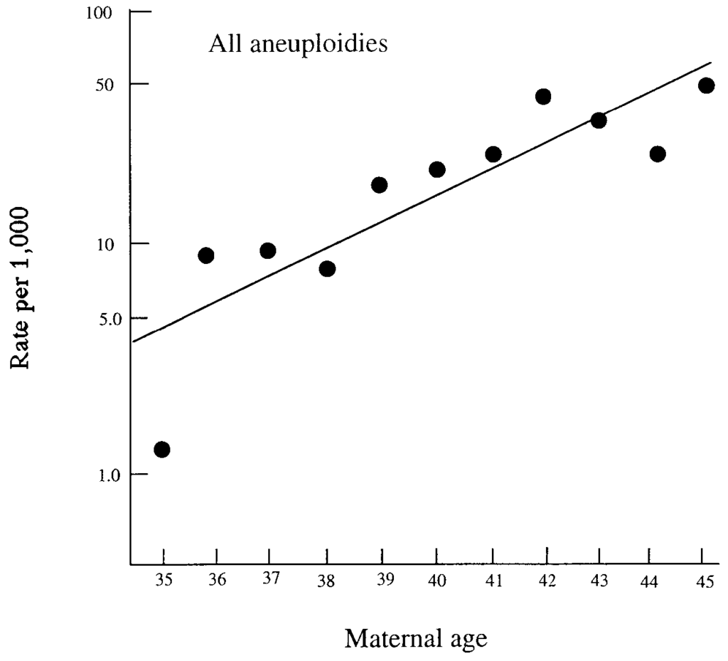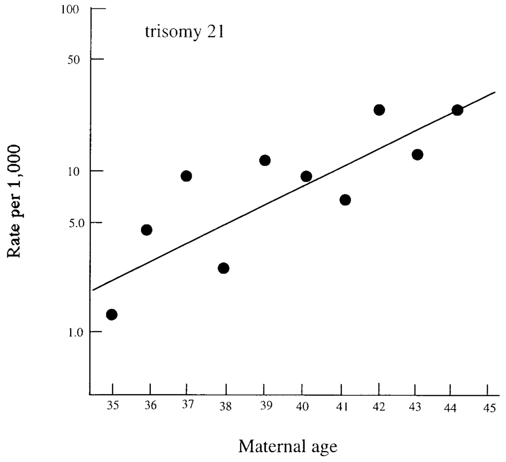 众所周知,唐氏综合症 (21号染色体三体综合症) 和其他染色体异常的频率随着母亲年龄的增长而增加 (Polani等人) 。1976年;Schreinemachers等1982;弗格森-史密斯和耶茨1984年;Hook等人1984) 。妇产科医生、家庭医生和临床遗传学家正在从孕妇那里查询其后代具有细胞遗传学异常的可能性。事实上,即使没有被质疑,在假定的高风险情况下不向孕妇提供此类信息也被引用作为法律责任的基础。在 产前检查前的遗传咨询中,准确估计孕妇异常的风险非常重要。