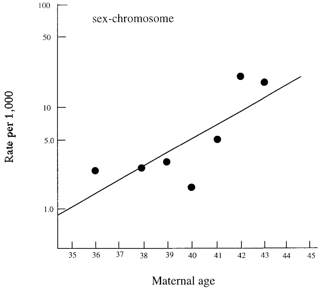 图3 染色体异常(XXY、XXX、XYY)的百分比 (纵向) 和母亲的年龄 (横向)