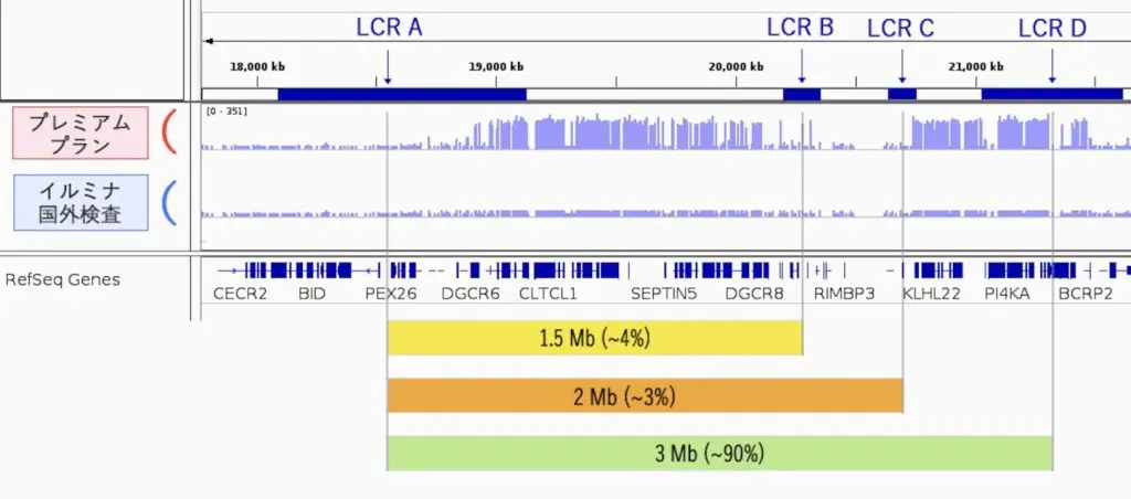 プレミアムプランの微小欠失症候群の検出の精度の高さは他の検査会社とは違います。最も検出が難しいとされているディジョージ症候群について説明します。プレミアムプランではディジョージ症候群において欠損しやすいところ(3Mb)の80%以上を100倍以上の深さで読んでいます。これがイルミナ国外検査だと最大で3倍(推定値)です。深さの違いは検査の精度に繋がります。通常のシークエンスでは30倍以上必要とされている数字が100倍以上あるということです。この読みの深さが精度の差になってくるのです。ここがプレミアムプランのおすすめになっております。
