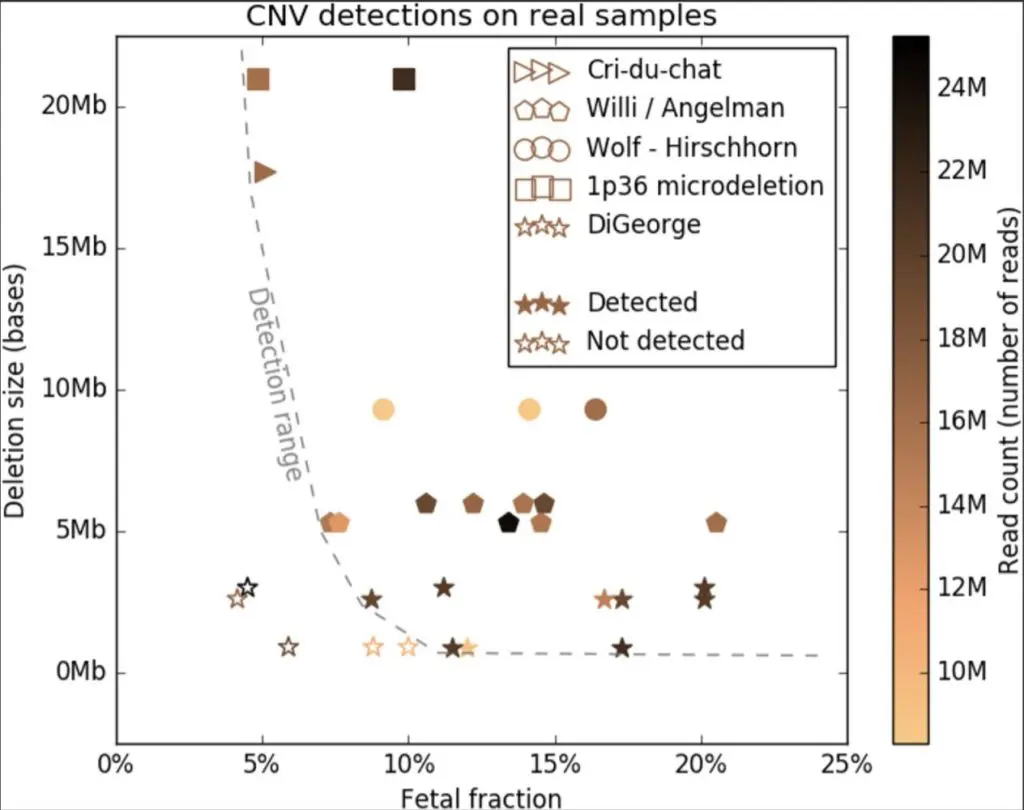 この原因としてはイルミナのmicrodeletion検査では欠損部位が3Mb以下でかつFFが10%以下の患者では検出することができないダメです。(Non-invasive prenatal testing (NIPT) by low coverage genomic sequencing: Detection limits of screened chromosomal microdeletionsより引用)