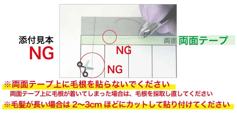 • 両面テープには毛根が触れないようにしてください。両面テープ上に毛根が着いてしまった場合は、毛根を採取し直してください。
