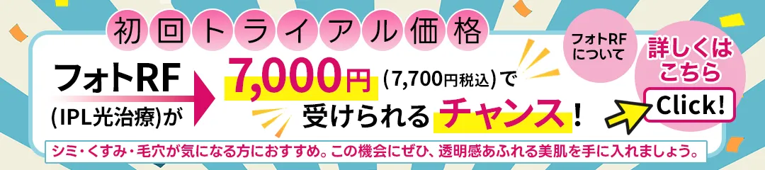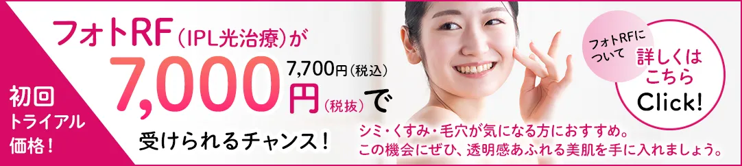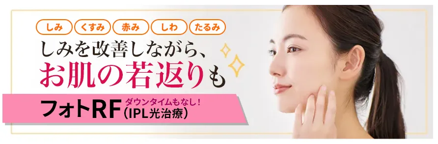 フォトRF(IPL光治療)は、これまでの光治療とは異なり、IPL(光エネルギー)をさらに進化させたAPL(アドバンスト・パルス・ライト)と高周波エネルギー(RF)の組み合わせによる、美容医療機器です。光と高周波のダブルアクションで、レーザーや光治療だけでは達成できなかった肌の奥までの治療を、効果的にできるようになりました。それにより、しみやくすみ以外に肌の張りや小じわ・たるみ・にきび・にきび跡・赤みにも効果を発揮します。