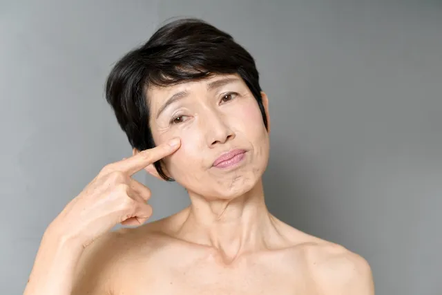 - 首の横ジワ・肌理の粗さ:乾燥と弾性低下が絡む帯状ライン、全体のテクスチャの乱れ。