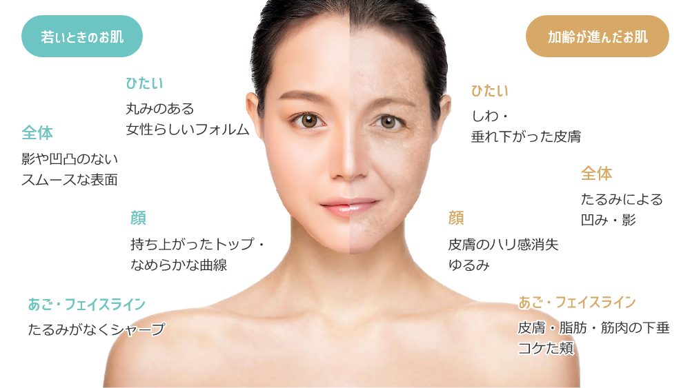 ④皮下組織の構造がもろくなり、はりや弾力を失い、余った皮膚が下がってくる