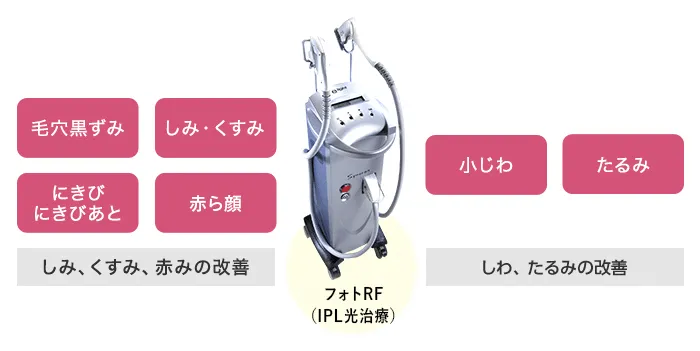 - フォトRF(IPL光治療)とは、IPL(フォト)とRF(高周波)の2種類の光を同時に照射することができる機械です。