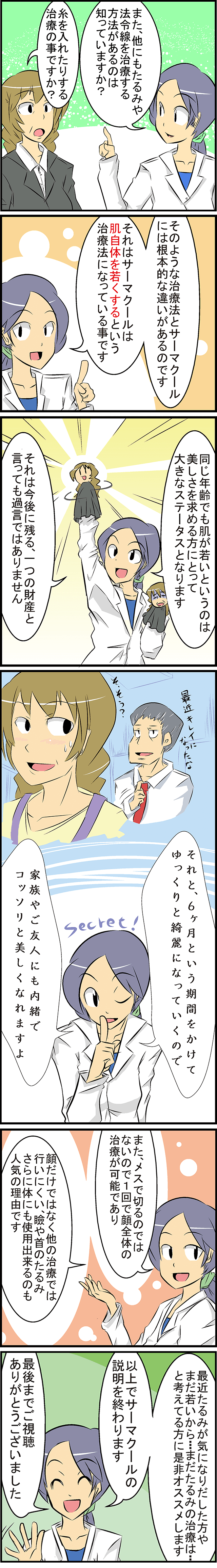 この高周波治療は現在世界的にもっとも注目されている治療で、レーザーやフォトフェイシャルについで出現した第3世代の治療法で、最新アンチエイジング医療機器として特に注目されています。 サーマクールはアメリカFDA(米国食品医薬品局)およびHPFB(カナダ健康製品食品局)からメスを使わない非外科的治療でのフェイスリフトとニキビ治療にその効果とフェイスリフトとニキビ治療に効果の高い医療機器です。 - サーマクールは高周波エネルギーにより熱を与える機械です。その熱によるやけどなどを心配される方がいらっしゃいますが、サーマクールから照射される高周波エネルギーは表皮の奥2.5~3mmの部分に直接届き表面はしっかり冷却されますので傷をつけずに肌の奥だけに熱を与えます。