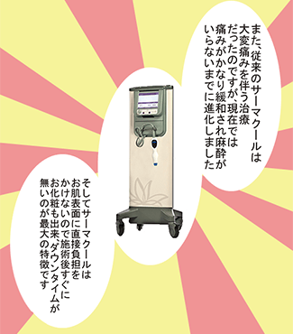 Thermacool 是一种利用高频能量产生热量的机器。 有些人担心热量会灼伤皮肤,但 Thermacool 发出的高频能量可深入表皮 2.5 至 3 毫米,并冷却表皮,因此它只给皮肤深处加热,不会造成疤痕。