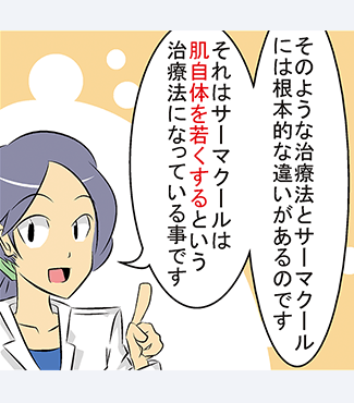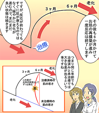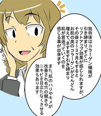 人类有能力自己治愈伤口。换言之,是自然治愈伤口的能力,是利用该能力的效果。曾经受到热能刺激而变性的胶原蛋白在被替换的过程中迅速增加,而作为皮肤张力来源的胶原蛋白比治疗前增加得更多。它还具有在伤口愈合过程中收缩胶原蛋白的作用。据说这项工作大约持续4-12周,这是一个长期的效果。