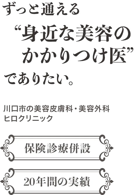 ヒロクリニック美容皮膚科・美容外科は開院以来10余年、地域に密着した、温かい医療のご提供を目指し、皆様の“身近な美容のかかりつけ医”でありたいと願っています。当院では単に営利目的のセールス、ご希望されない施術の無理なお勧めは一切いたしません。美容カウンセラーなどもおりませんので、医師が直接皆様のお悩みをお伺いし、お悩みの解決に何が一番良いのかを丁寧に診察いたします。 治療後は皆様に笑顔でお帰りいただくために、医師・看護師・スタッフが一丸となり、心を込めてサポートさせていただきます。