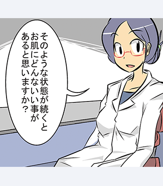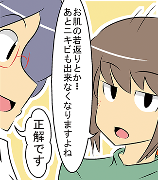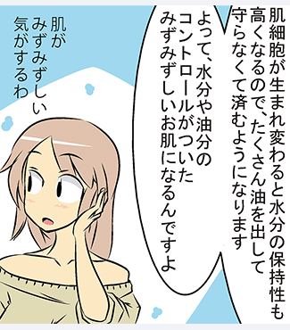 ターンオーバが正常に行われる状態にすることにより、にきびの予防や皮脂の分泌の正常化が図れるとともに、しみ、くすみなどが治ってゆく過程もスムースに行われるようになります。