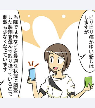 当院では、自家調剤ではなく、pHを適切に調整したお肌に負担の少ない製剤を使用していますので、刺激も少なく、今まで刺激が苦手で続けられなかった方にも安心してお使いいただけます。