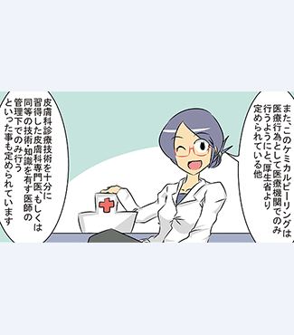 また、ガイドラインには「皮膚科診療技術を十分に修得した皮膚科専門医ないしそれと同等の技術・知識を有する医師の管理下で行われる行為」と記載されています。専門の医療機関で治療を受けられることをおすすめします。