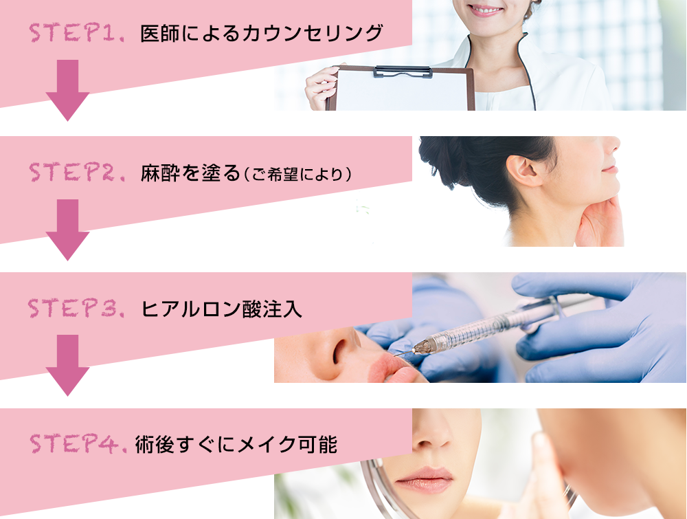 ヒロクリニックでは、最高濃度(25%)かつ麻酔入りのヒアルロン酸を使用しております。また、細い針で丁寧に注入していきますので、痛みはほとんどありません。内出血しにくい特別な針など、様々な治療法をお選びいただく事も可能です。