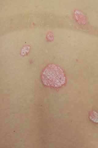 皮膚病変は厚い銀白色の皮膚に覆われ、その下に発赤があります。