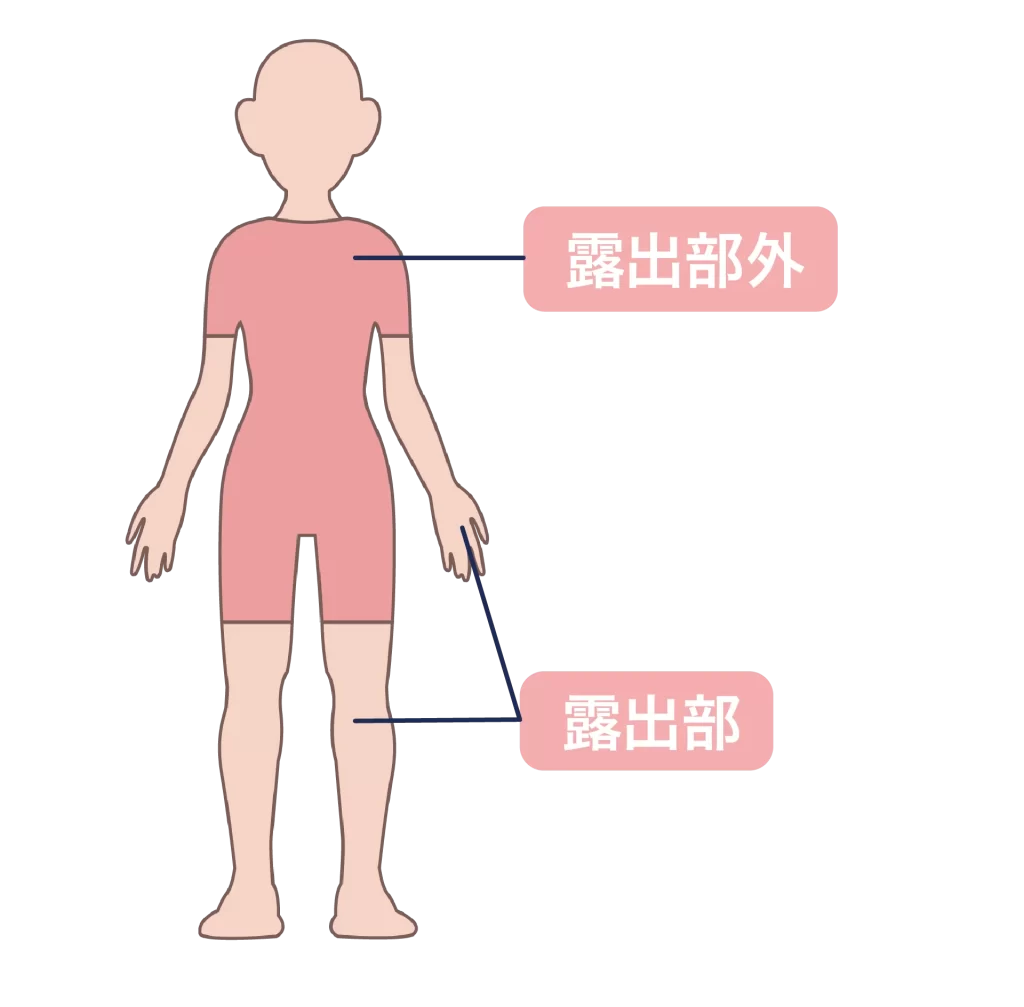 - 胸、腹部、背中、腰、臀部、大腿など、普段衣服で覆われる体幹や四肢の部分が「露出部以外」です。
