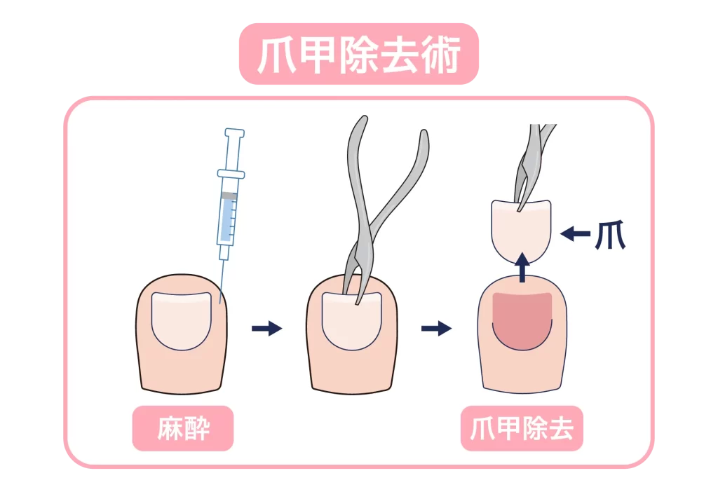 「爪甲」とは爪のことです。爪甲除去術は、爪を部分的または全部取り除く手術です。