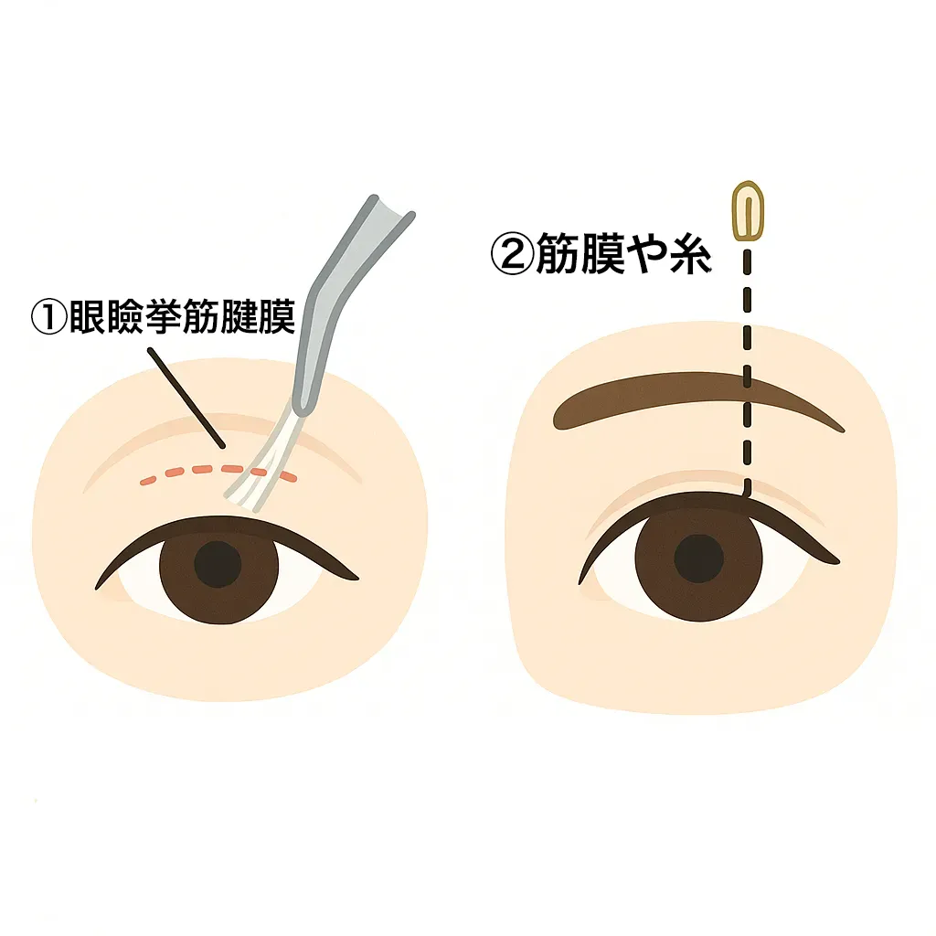 • 自分の筋膜や人工糸で、まぶたをおでこの筋肉(前頭筋)に吊り上げる方法