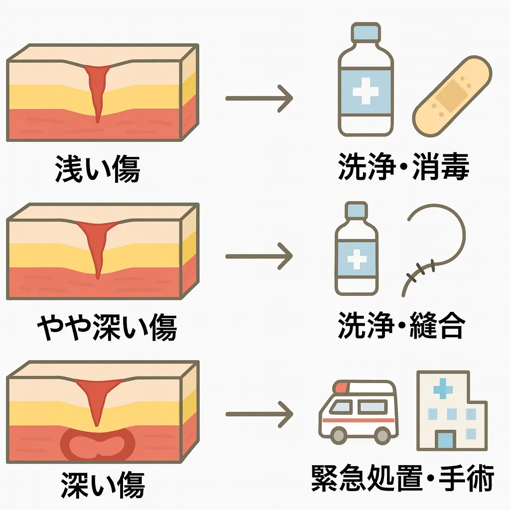 まとめると、「創傷処理(筋肉・臓器に達しない)」は、皮膚の浅い傷をきれいに洗って閉じ、感染を防ぎながら治りを助ける処置です。日常のケガで多く行われる、比較的シンプルで安全な治療です。