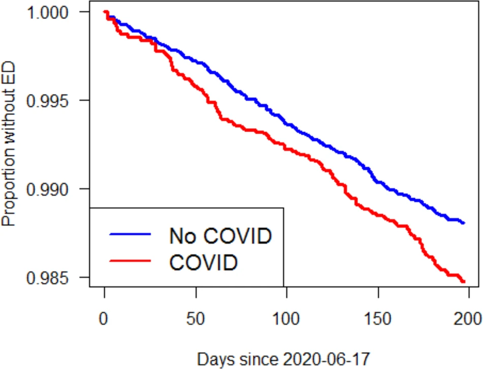 COVID-19感染歴の有無に基づくEDなしの割合を示すカプラン・マイヤー曲線。Hebert, K.J., Matta, R., Horns, J.J. et al. Prior COVID-19 infection associated with increased risk of newly diagnosed erectile dysfunction. Int J Impot Res 36, 521–525 (2024). https://doi.org/10.1038/s41443-023-00687-4, Fig 2