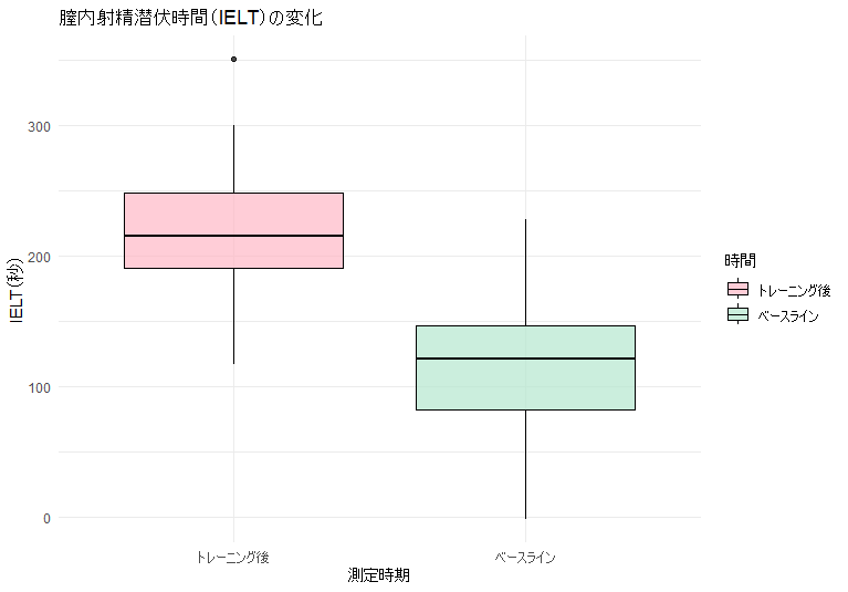 このグラフは、膣内射精潜伏時間(IELT)(性交時に射精するまでの時間)がトレーニング前後でどのように変化したかを示しています。