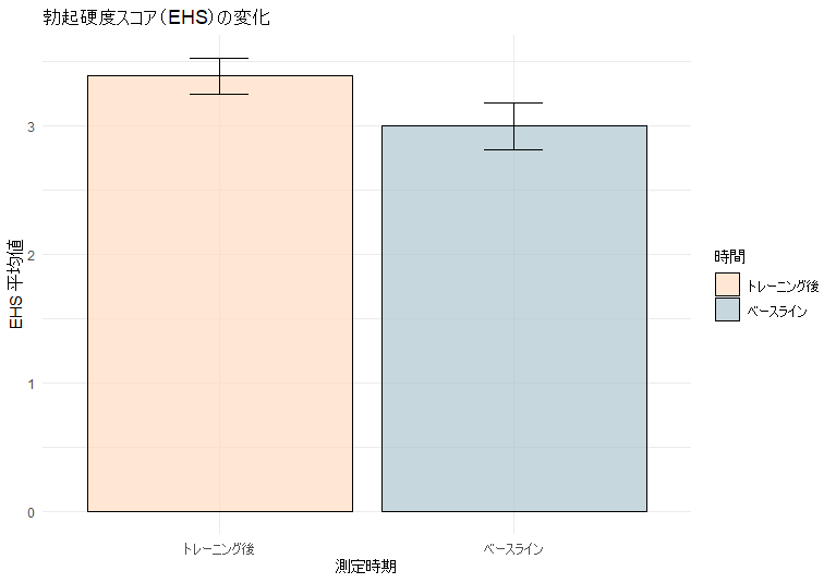 このグラフは、勃起硬度スコア(EHS)がトレーニング前(ベースライン)とトレーニング後でどのように変化したかを示しています。青色の棒はトレーニング前のEHS、オレンジ色の棒はトレーニング後のEHSを表しています。