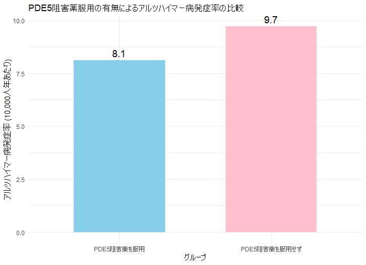 - PDE5阻害薬を服用していたグループでは、アルツハイマー病の発症率は10,000人あたり年間8.1件