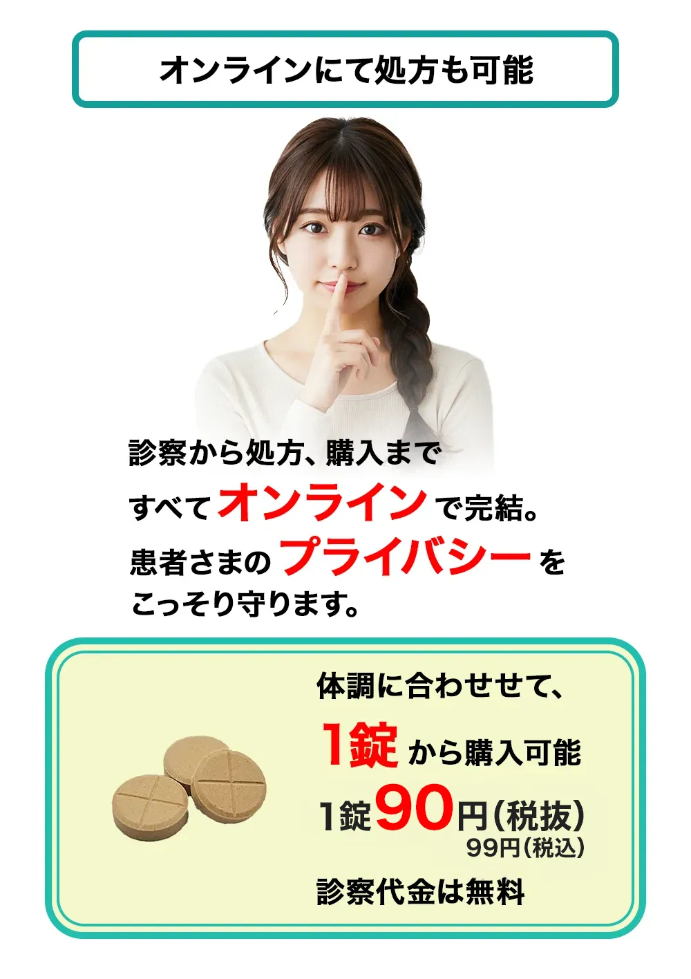 ・診察結果に基づき、処方は医師が医学的に適切と判断した範囲で行います。 ・処方薬は薬機法に基づき、対面診療と同等の基準で実施され、麻薬・向精神薬等の処方は行いません。 |
