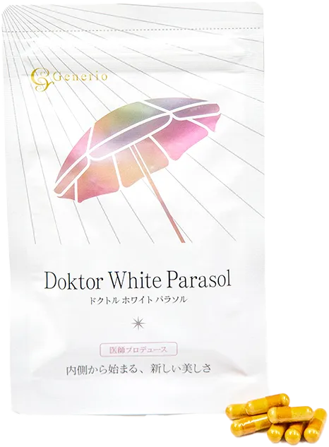 ドクトルホワイトパラソルは、塗るだけでは防ぎきれない紫外線ダメージを内側からケアする次世代型サプリメントです。紫外線による光老化を防ぐだけでなく、肌の透明感をアップし、若々しい美肌をサポートします。