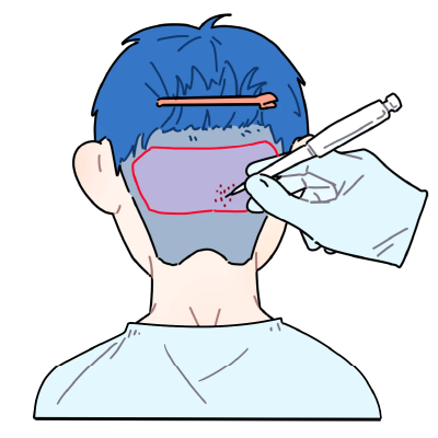 局所麻酔後に直径1ミリ前後の専用機械で、薄毛になりにくい後頭部や