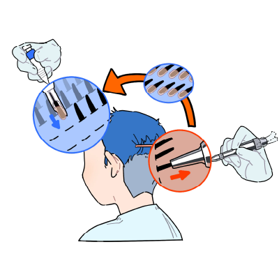どちらの方法もメスを使用せず、専用のパンチを用いて毛包ごと毛髪をくり抜き採取するため、痛みが少なく、術後の傷跡が小さいのが特徴です。 薄毛になりにくい後頭部や側頭部の毛根を採取し、薄くなった部分に移植します。 さらに、自分の髪を使用するため、拒絶反応が起こりにくく、元々の性質を保ったまま定着し、一生涯にわたって生え変わり続ける可能性が期待できます。また、少しずつ髪が伸びていくので、仕上がりもとても自然です。