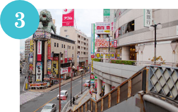 「PIA」からさらに「旧そごう」方面へ右に曲がり真っ直ぐ進みますと、左手に歩道橋から降りる階段があります。