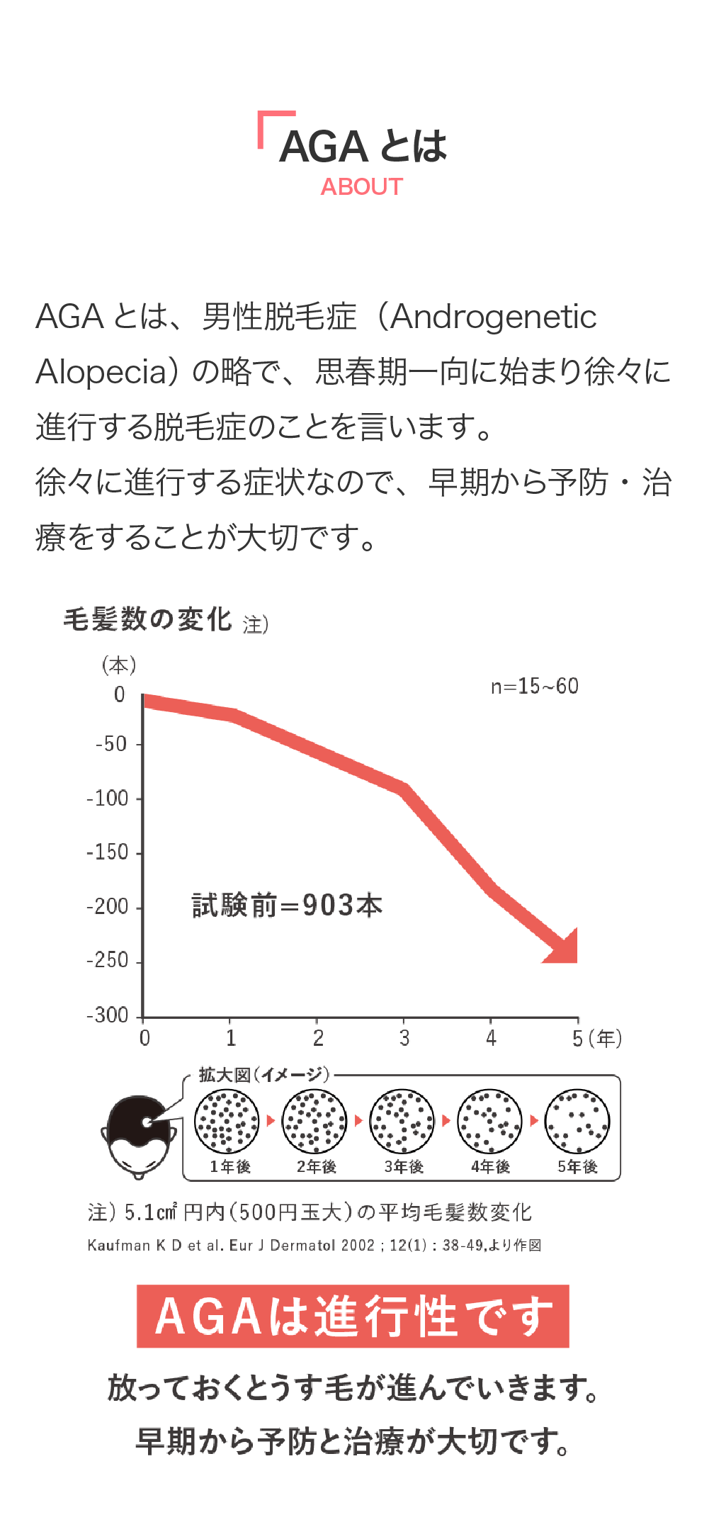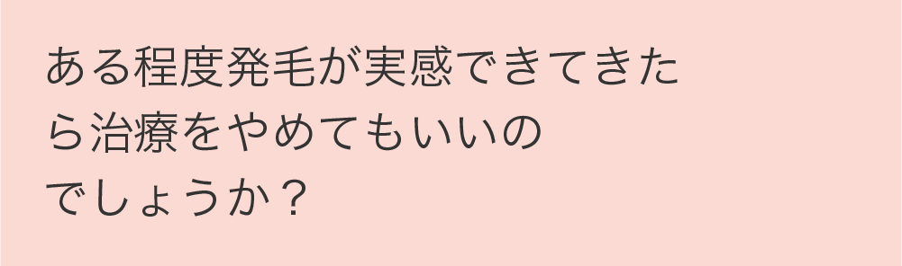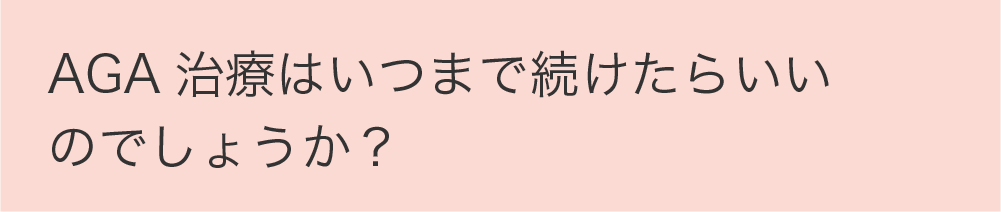 AGAは慢性的な疾患のため、症状が改善しても治療をやめてお薬の効果がなくなると再び進行し、少しずつ治療前の薄毛の状態に戻ってしまうことがあります。ヘアサイクルが正常化するまで、2〜3年間は治療を継続することをおすすめします。