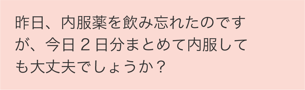 飲み忘れた場合は、忘れた分はスキップして、気づいた日から服用を再開してください。副作用のリスクが高まるので、1度に2回分は服用しないでください。