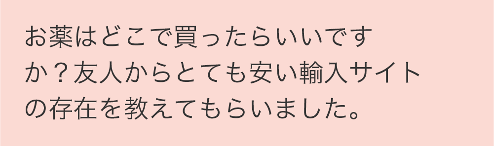 お薬は病院・クリニックにて処方されることを強くおすすめします。いわゆる個人輸入代行サイトで薬が安く購入できる理由は、本来のルールである、政府が求める診察や管理を怠っているからです。またこれらのサイトで販売される薬には偽物が含まれている可能性もあり、過去には個人輸入サイトで購入されたお薬で副作用が出たということも報告されており、厚生労働省からも注意喚起がされております。病院・クリニックで診察を受けていただいた上で処方されたお薬を使用されることを強くおすすめします。