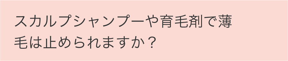 通販やドラッグストアで購入できるスカルプシャンプーや育毛剤では、頭皮環境を改善する効果は期待できますが、ご質問の「薄毛を止めたい」または「発毛したい」という希望がある方はAGA治療を始められることを強くお勧めします。当院のAGA治療では、薄毛の主な原因であるDHTの発生を抑える効果や、ヘアサイクルを正常化させる効果などが含まれた医療用医薬品を症状に合わせて組み合わせた複数のプランをご用意しています。
