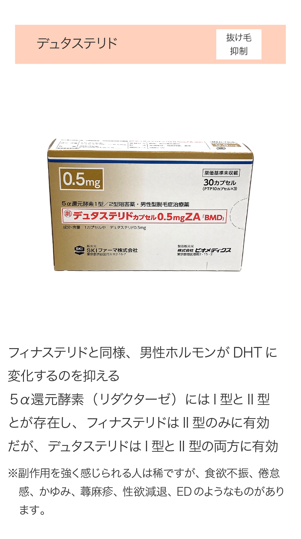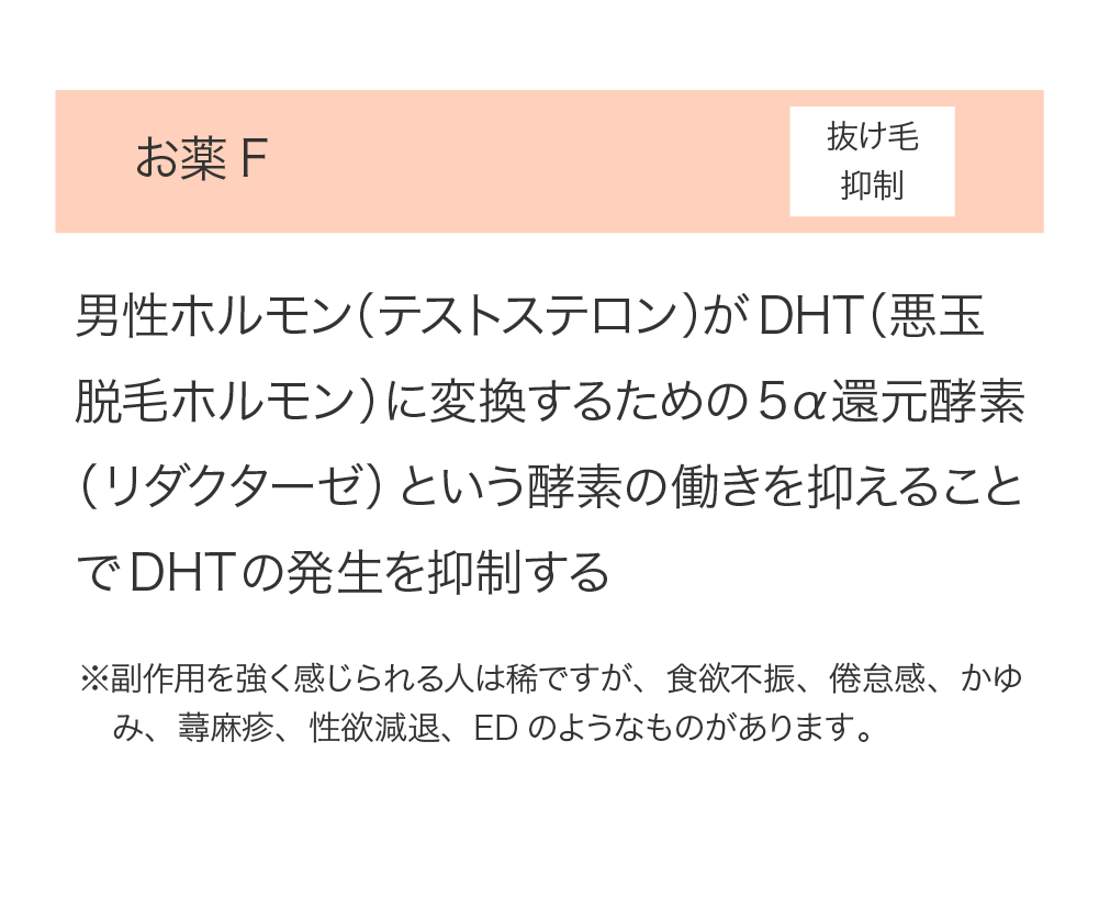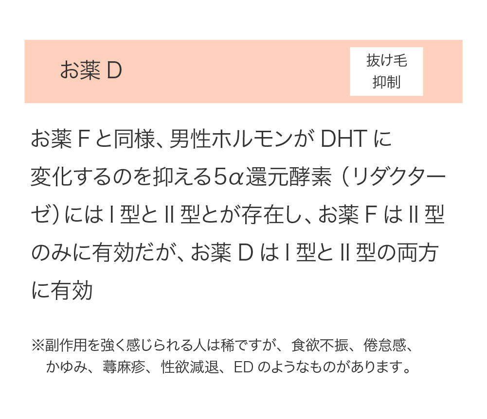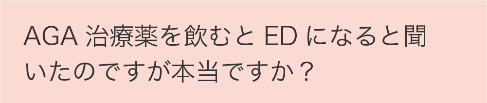 AGA治療薬であるお薬Fやお薬Dの副作用として、性欲減退、勃起不全などの性機能の低下がありますが、割合として約1~5%とかなり低いとされています。もし副作用が気になる場合にはEDの治療薬を試していただくことも可能ですのでご相談ください。