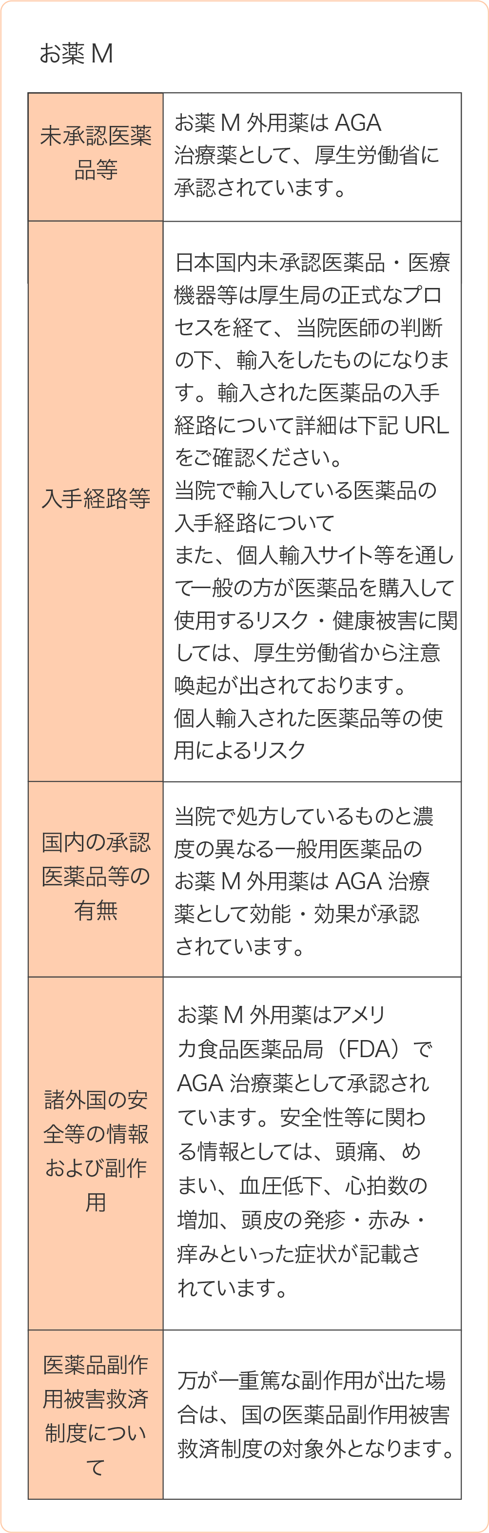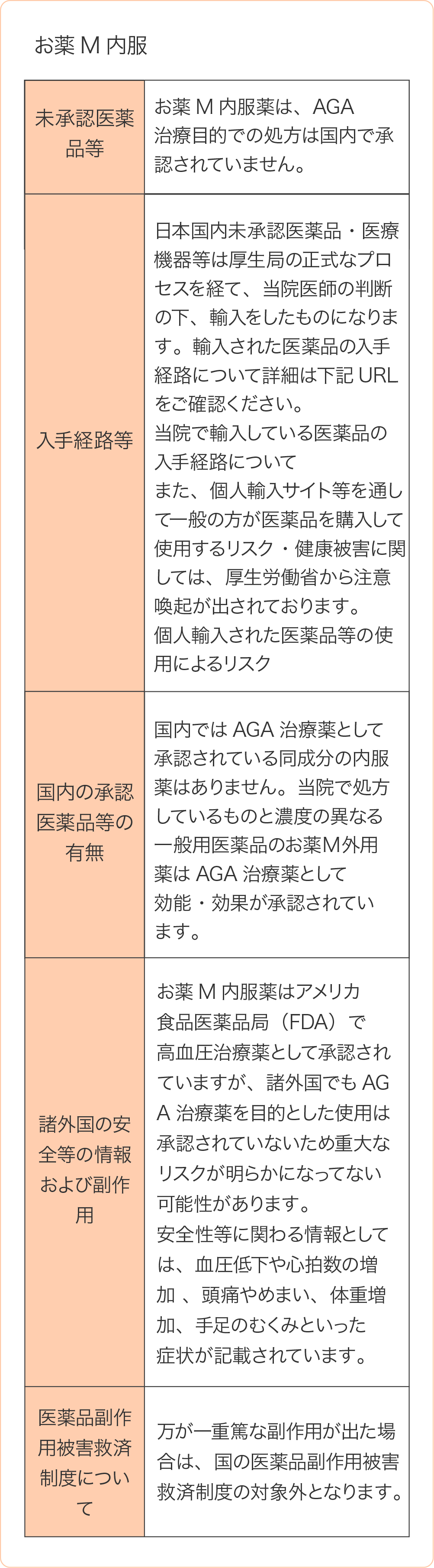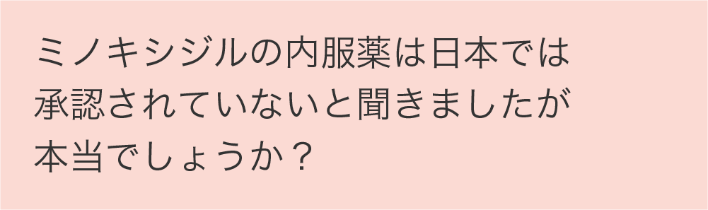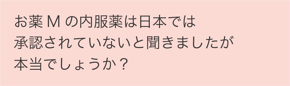 はい、現在日本ではお薬M内服薬は承認されておりません。しかし米国を含む海外諸国では医薬品として認可され、処方薬として利用されております。当院では、AGA薄毛治療の専門知識と経験のある医師が処方し、副作用の有無を確認しながら継続していくのであれば、お薬M内服薬はAGA治療に有効かつ強力な治療薬だと考え、処方をご希望の方には医師の判断のもと処方させていただいております。もし内服薬の利用に不安がある方は、外用薬も処方可能ですので、当院の医師にご相談ください。