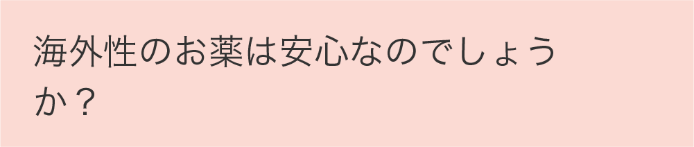 海外製につきましては、オリジナルパッケージで海外の製薬会社に委託して、一元的に製造輸入しております。国内に入ってくる際には、厚労省の薬監審査を通過しており、認可を受けているお薬ですのでご安心ください。一方、個人輸入品は、こうしたチェックが入っていないため、厚労省からも注意喚起がなされています。個人輸入品とクリニックで処方されるお薬は全く別物とお考えください。