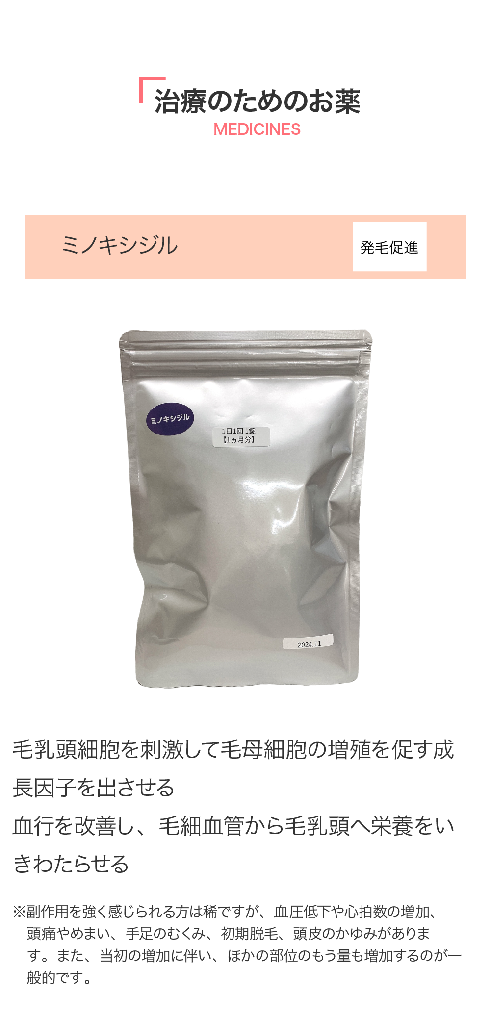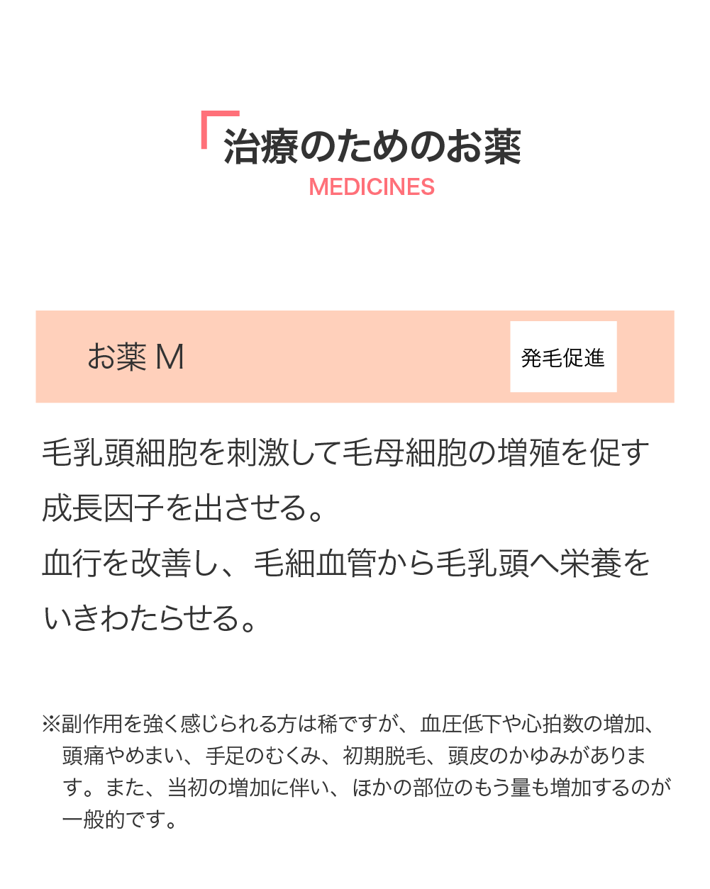 AGA治療薬のお薬M内服はもともと血圧を下げる降圧薬として使用されていたお薬であり、毛細血管を拡張して血流を改善する作用があります。(それにより髪の毛の毛根に栄養をおくり発毛を促します)しかしそのために心臓が弱い方では、動悸や息切れ症状が出る場合があります。