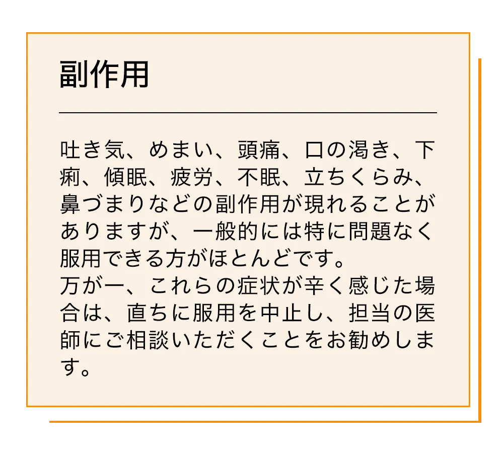 ・診察結果に基づき、処方は医師が医学的に適切と判断した範囲で行います。 ・処方薬は薬機法に基づき、対面診療と同等の基準で実施され、麻薬・向精神薬等の処方は行いません。 |