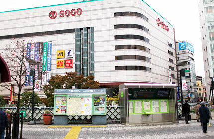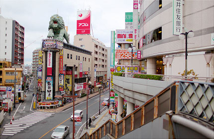 「PIA」からさらに「旧そごう」方面へ右に曲がり真っ直ぐ進みますと、左手に歩道橋から降りる階段があります。