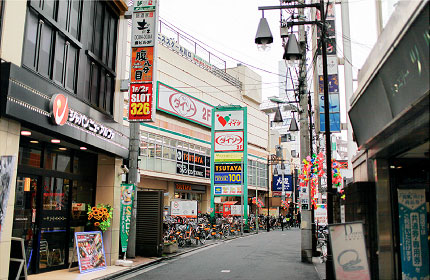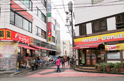 歩道橋から降りて真っ直ぐ進みますと、「富士そば」がありますので、そちらから右手にある路地に入ってください。