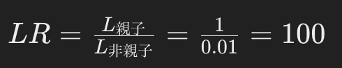 この尤度比100は、親子関係がある仮説が、親子関係がない仮説に対して100倍も支持されることを示しています。