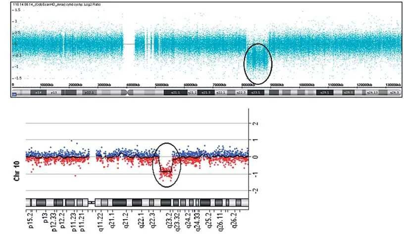 図1.  罹患者のアレイ結果。 CytoScan HDチップを用いた染色体10の染色体マイクロアレイ分析(CMA)ハイブリダイゼーションプロファイルはq22.3q23.2(81,446,577~89,253,430; hg 19)における7.8Mbの微小欠失を示した。 Agilent Human Genome G3 SurePrint 8×60 Kマイクロアレイを用いた染色体10のCMBハイブリダイゼーションプロファイルによりq22.3q23.2の微小欠失が確認された。
