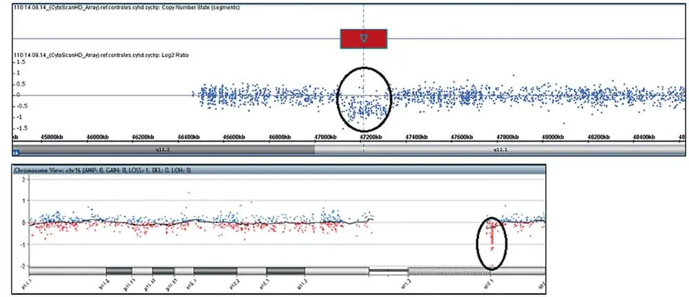 図2. 影響を受けた個人の結果を配列する。 CytoScan HDチップを用いた染色体16の染色体マイクロアレイ分析(CMA)ハイブリダイゼーションプロファイルはq12.1(47,127,281~47,316,339; hg 19)における189kbの微小欠失を示した。 Agilent Human Genome G3 SurePrint 8×60 Kマイクロアレイを用いた染色体16のCMBハイブリダイゼーションプロファイルによりq12.1マイクロ欠失が確認された。