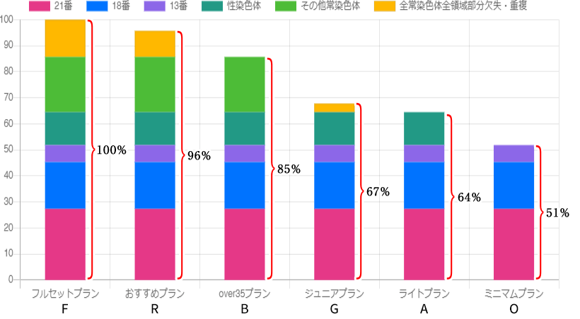 妊婦さんがヒロクリニックNIPTでよく選ばれている検査プランの「検査カバー率」を数値にしたものが、上の棒グラフになります。