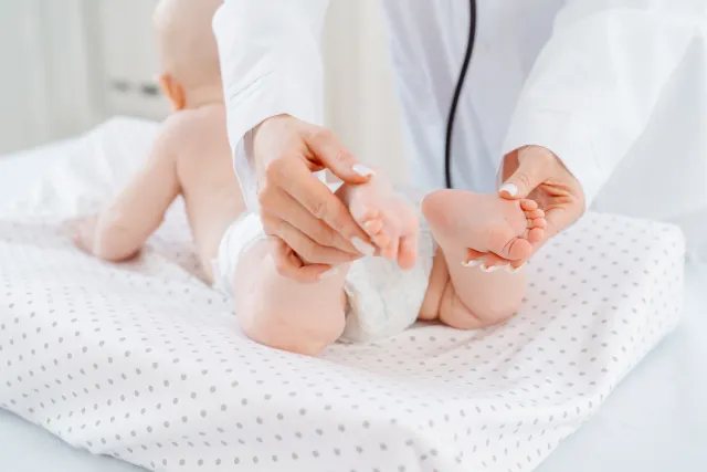 医師は、頭の形、顔立ち、手足の指の状態などを詳しく観察します。